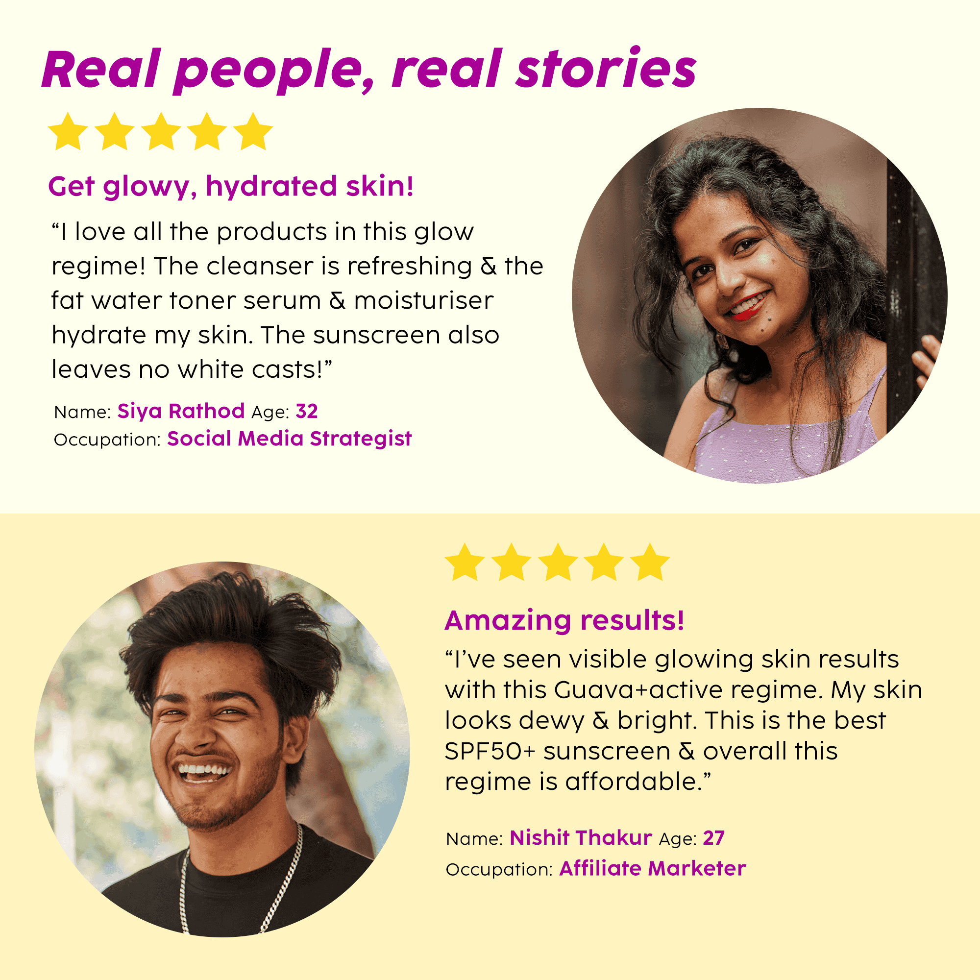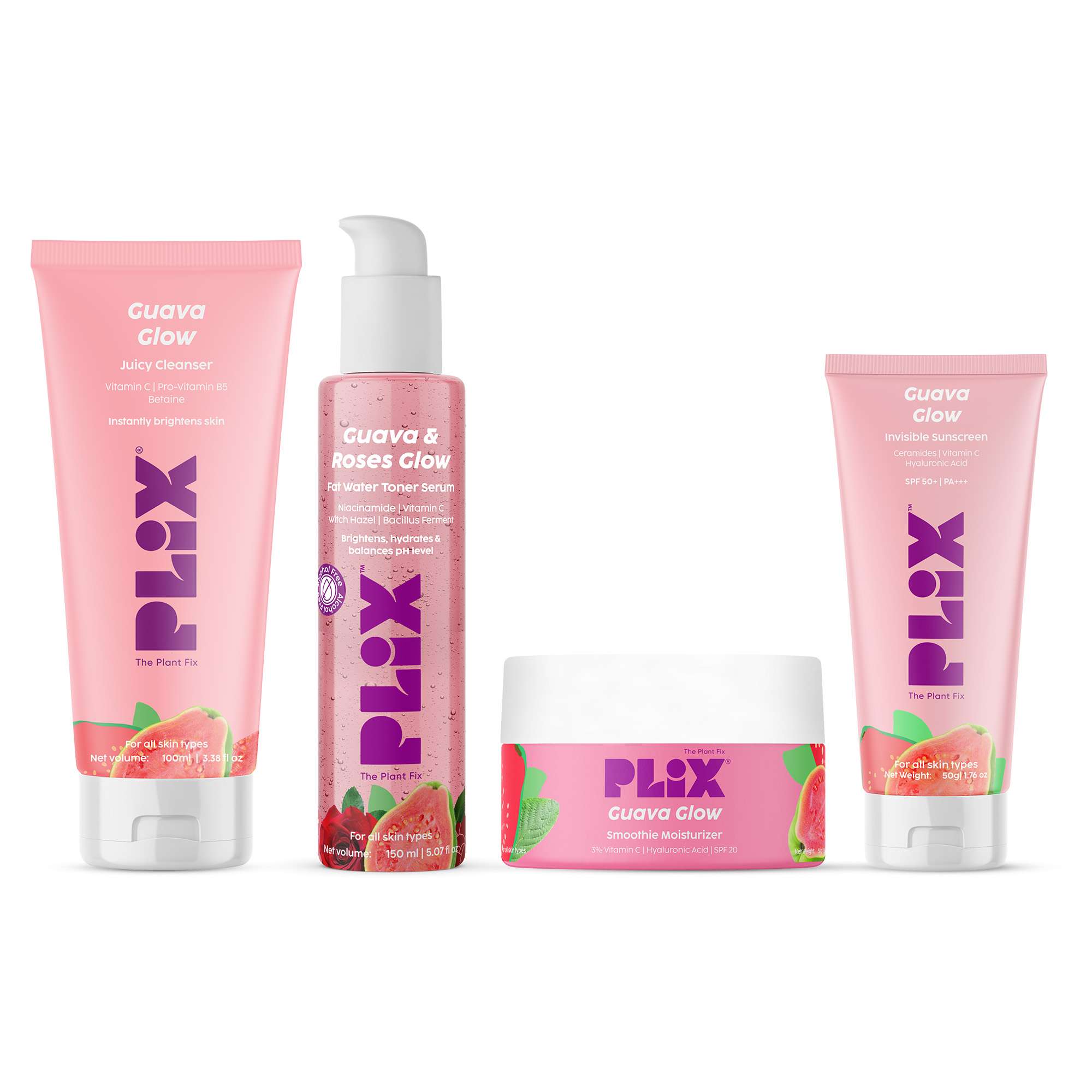 | Ingredients | Face wash - 0.2% Vitamin C, 0.1% Alpha Lipoic Acid , 0.5% Pro Vitamin B5, Guava Extract | Moisturizer - 3% Ethyl Ascorbic Acid (Vitamin C), 2% Alpha Lipoic Acid Complex, 1% Guava Extract, 0.2% Hyaluronic Acid | Toner - Niacinamide, Vitamin C, Bacillus ferment, Witch Hazel, Rose Water, Guava extract | Face wash - 0.2% Vitamin C, 0.1% Alpha Lipoic Acid , 0.5% Pro Vitamin B5, Guava Extract | Moisturizer - 3% Ethyl Ascorbic Acid (Vitamin C), 2% Alpha Lipoic Acid Complex, 1% Guava Extract, 0.2% Hyaluronic Acid | Sunscreen - 1% Ceramides 11 complex, 0.2% Vitamin C, 5kda Hyaluronic Acid, 1% Suncat DE | Immune Boost Effervescent - Amla Extract Vitamin C Zinc sulphate |