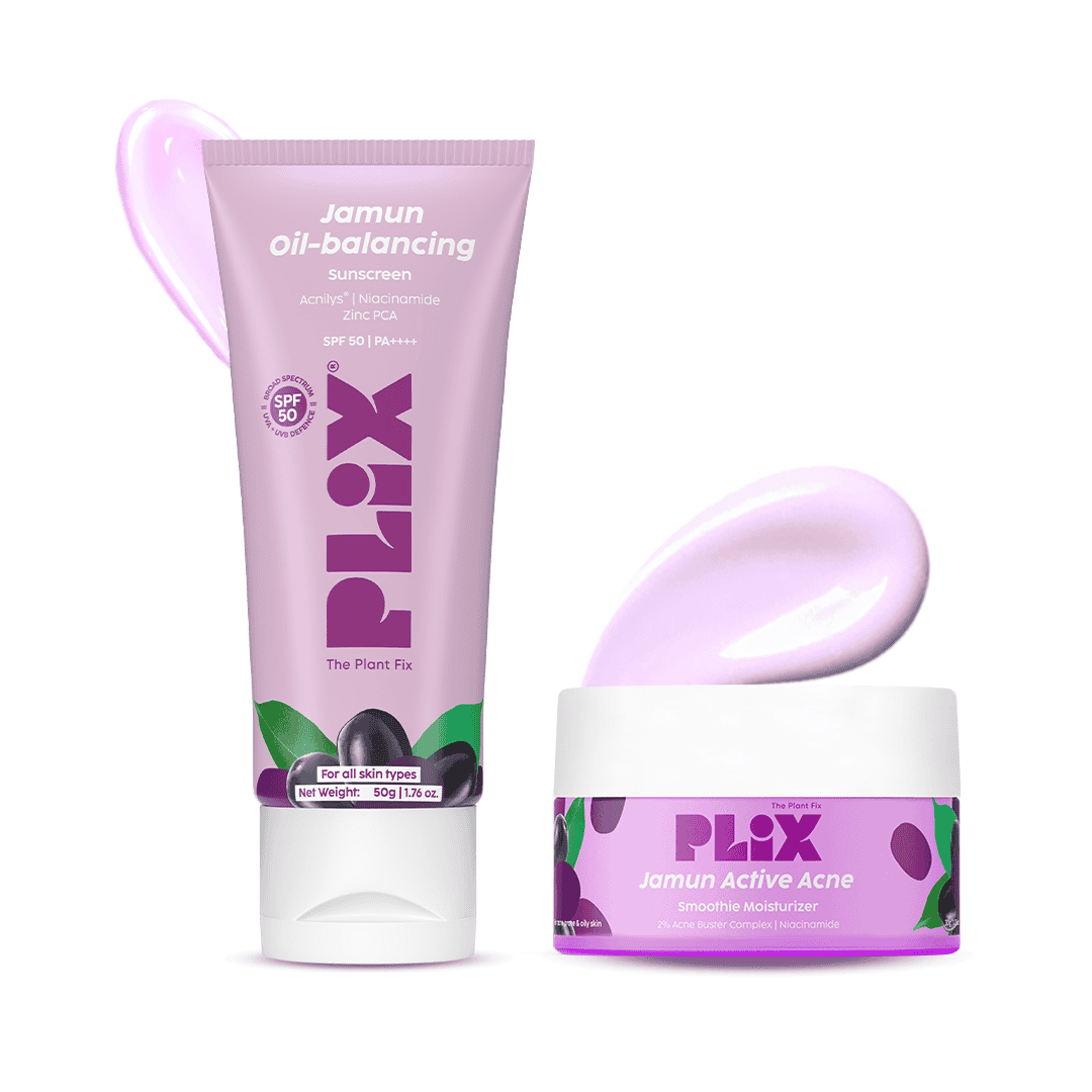 | Ingredients | Sunscreen: Aqua, Ethylhexyl Methoxycinnamate, Butyl Methoxydibenzoylmethane, Benzophenone-3, Phospholipids, Glycerine, Cetearyl Olivate (and) Sorbitan Olivate, Niacinamide, Sulphonic Acid Glyceryl Behenate, Aloe Barbadensis Leaf Extract, Syzygium Cumini (Jamun) Seed Extract, Terephthalylidene Dicamphor Sulfonic Acid, Sodium Hydroxide, Aluminum Starch Octenylsuccinate, Phenoxyethanol (and) Ethylhexylglycerin, Butyloctyl Salicylate, Sodium Polyacrylate, Hydroxypropyl Starch, Sodium Gluconate, D-Panthenol, Zinc PCA, Propanediol and Rhodomyrtus Tomentosa Fruit Extract (Acnilys), Oxothiazolidine, Fragrance. | Moisturizer: Aqua, Niacinamide, Syzygium cumini (Jamun) Seed Extract, Butylene Glycol, Phellodendron amurense Bark Extract,Glycolic Acid, PEG-60 Hydrogenated Castor Oil, Salix alba Bark Extract, Rehmannia chinensis Root Extract, Melia azadirachta Leaf extract, Scutellaria baicalensis Root Extract, Houttuynia cordata Extract, Glycine Soja Protein, Lactobacillus/Pear Juice Ferment Filtrate, Glyceryl, Hamamelis virginiana (Witch Hazel) Water, Propanediol, Glycerin, Sodium Acrylates Copolymer, Lecithin, Saccharide Isomerate (Pentavitin), Citric Acid, Sodium Citrate, Sodium Gluconate, Phenoxyethanol, Ethylhexylglycerin, Aroma, CI 16185, CI 42090. |