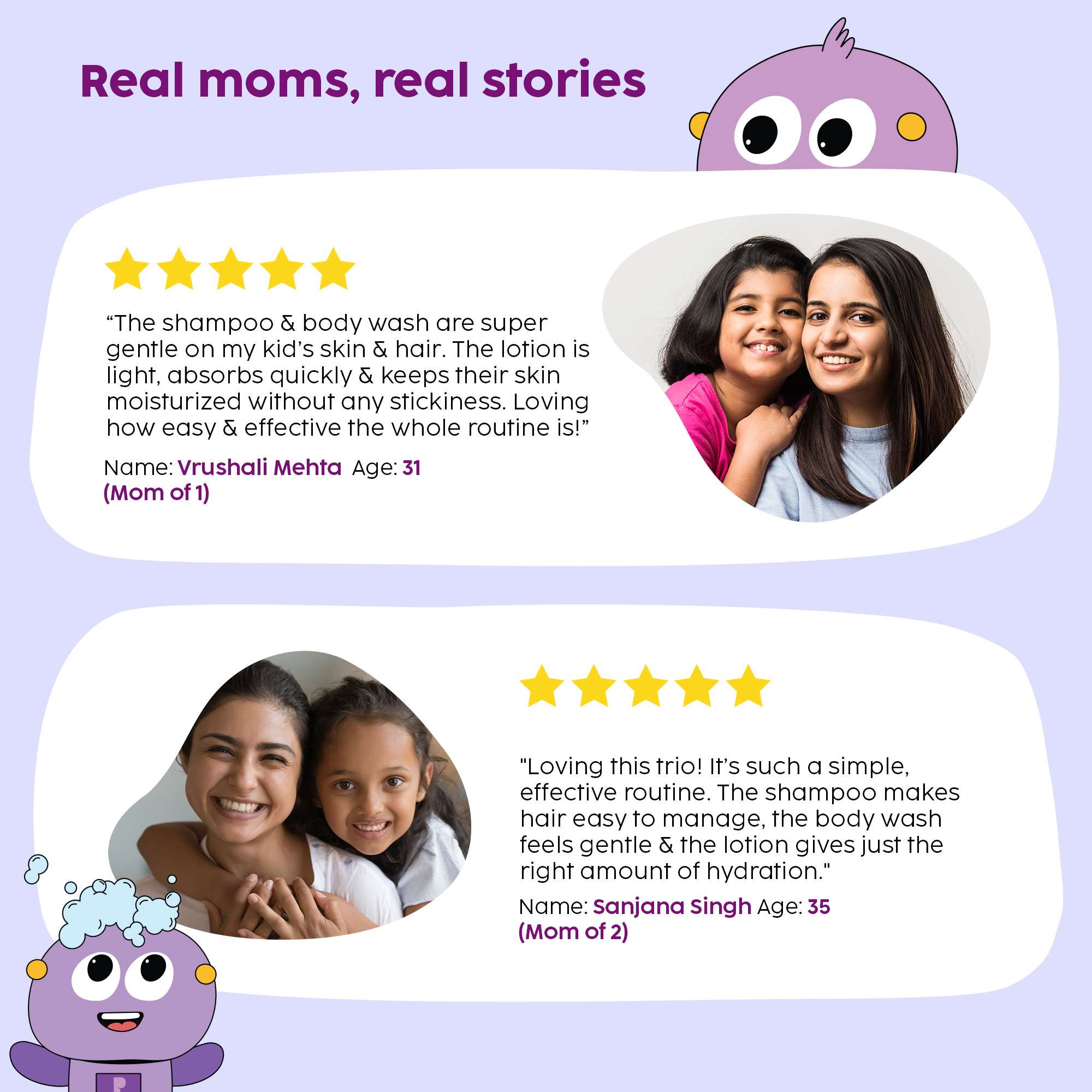 Ingredients | Shampoo: Moringa Seeds Oil, Chamomile Extract, Argan Oil, Aloe Vera Extract | Body Wash: Calendula Extract, Oatmeal Extract, Aloe Vera, Panthenol | Body Lotion: Shea Butter, Olive Squalene, Neem Extract, Aloe Vera |