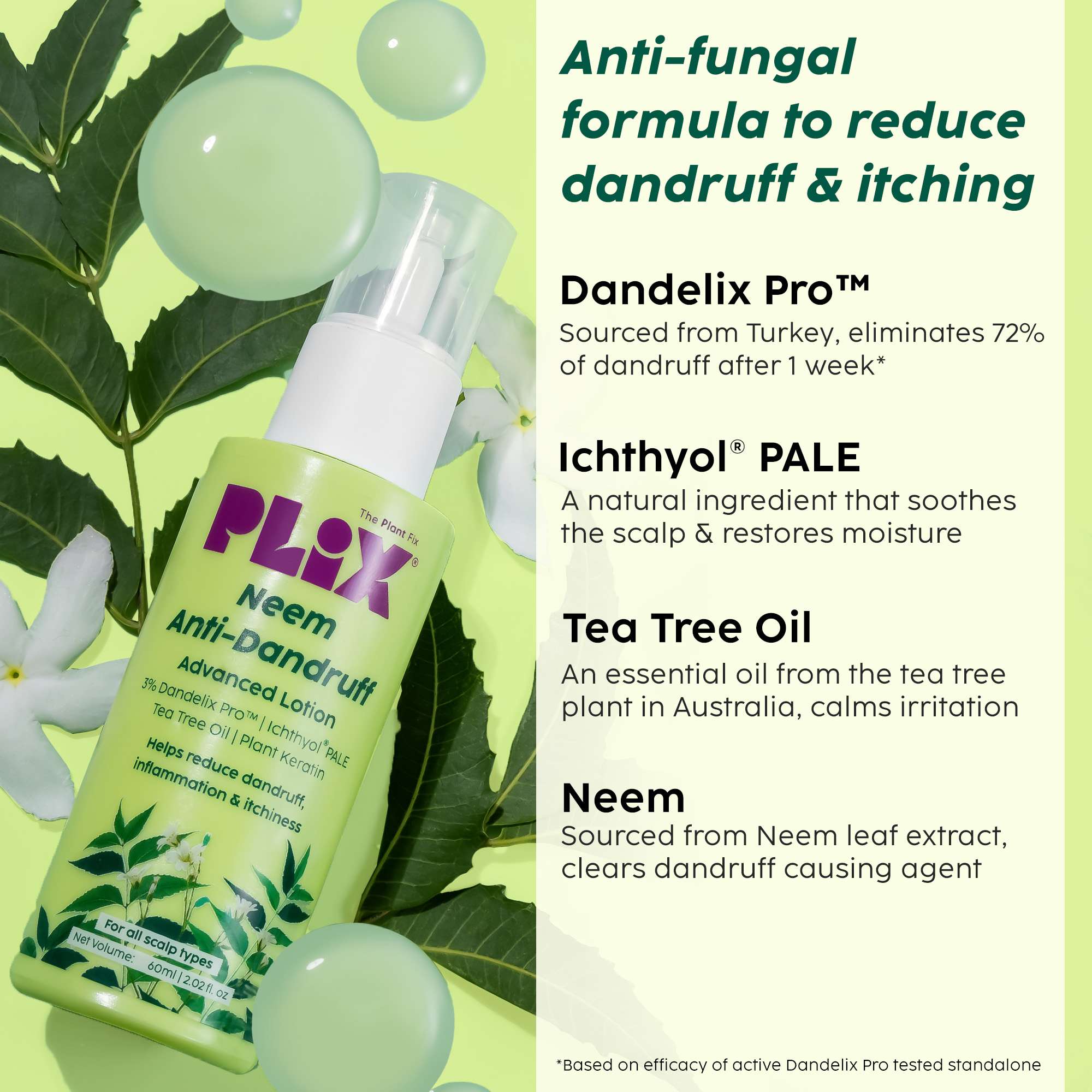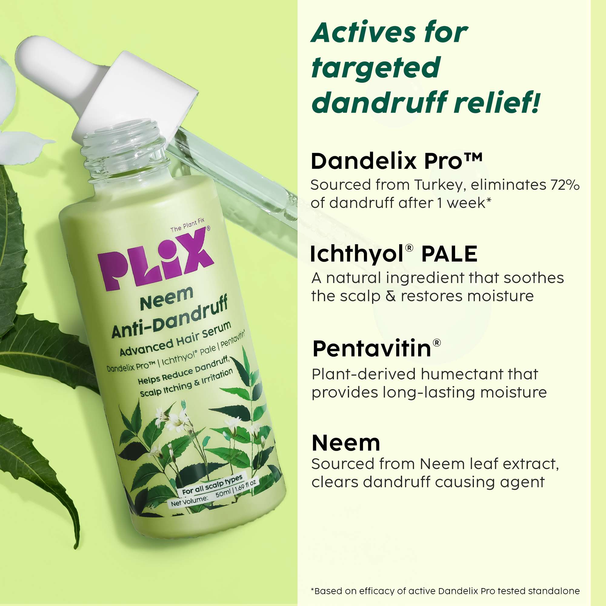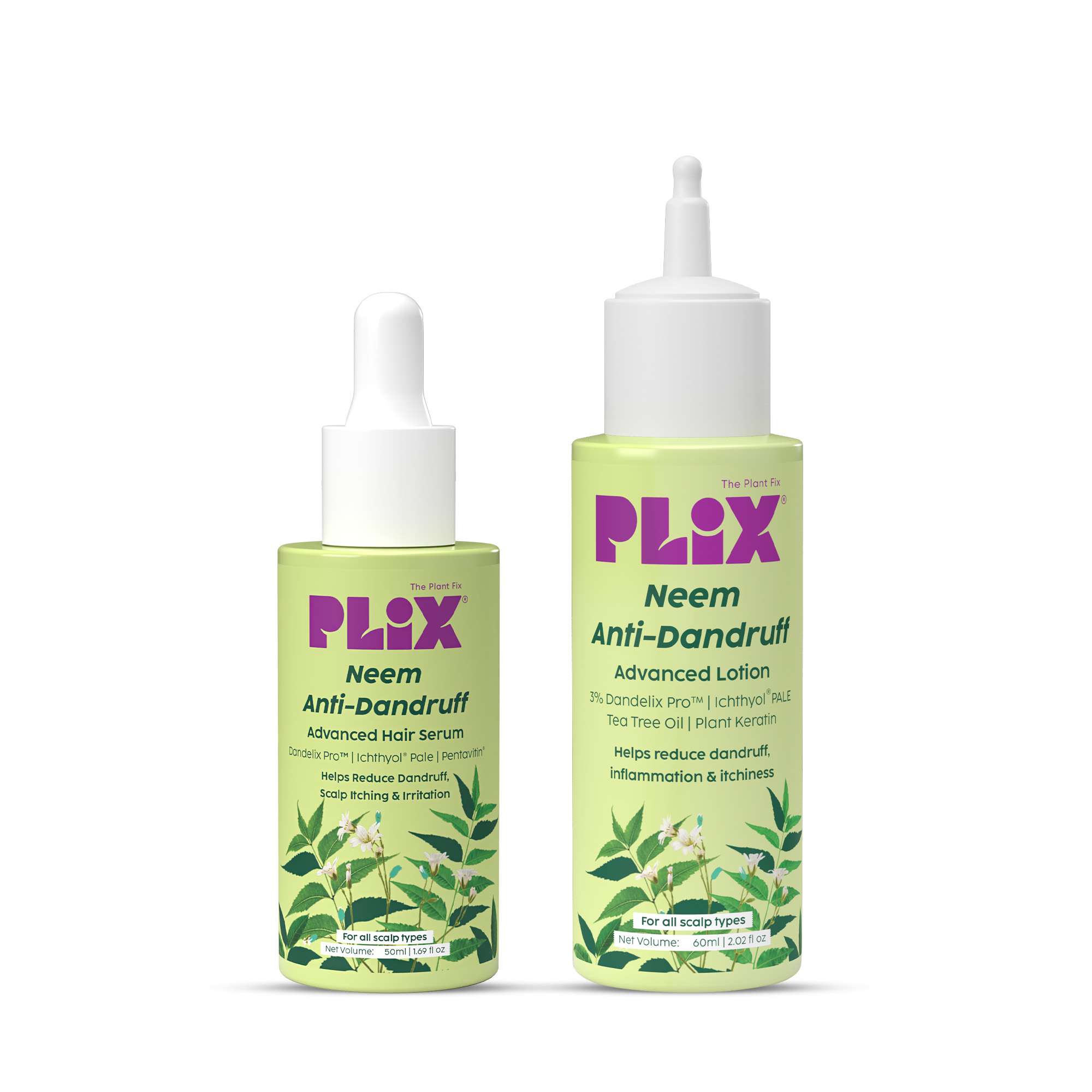 | Ingredients | Serum - 3% Dandelix Pro™, Ichthyol® Pale, Pentavitin®, Neem | Lotion - 3% Dandelix Pro™, Neem seed oil, Ichthyol® PALE, Tea Tree Oil |