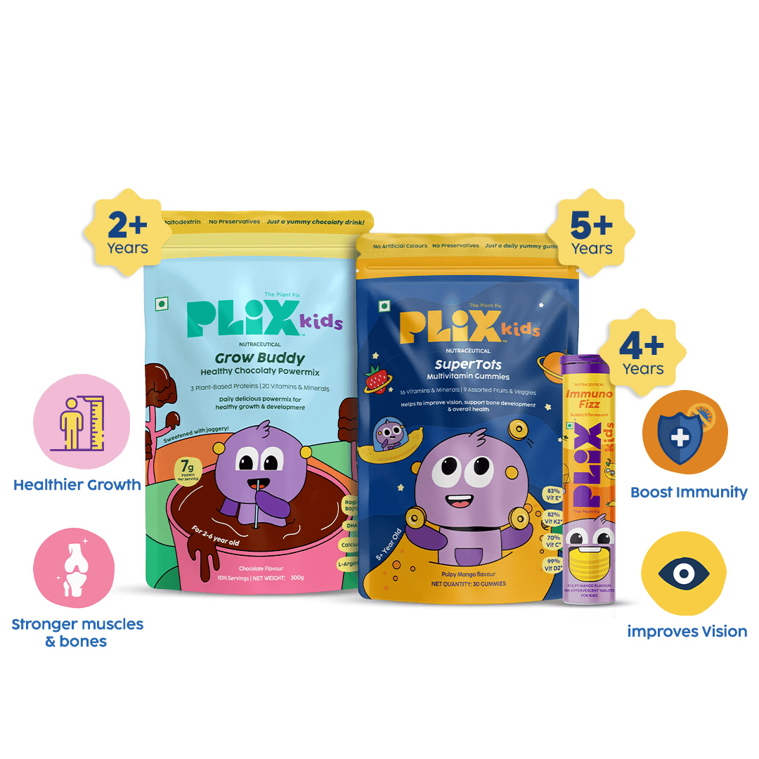 | Ingredients | GrowBuddy: 3 Plant Proteins (Peanut, Mung bean & Almond), Millets Blend (Ragi & Bajra), DHA, L- arginine, Vitamins Blend | SuperTots: Vitamin A, Vitamin B Complex, Vitamin D3, Nutrients packed | ImmunoFizz: Wellmune®, Ginger Extract, Tulsi Extract, Vitamin C |