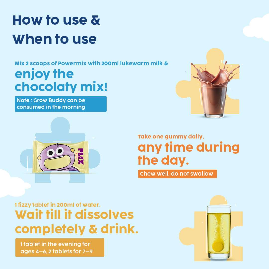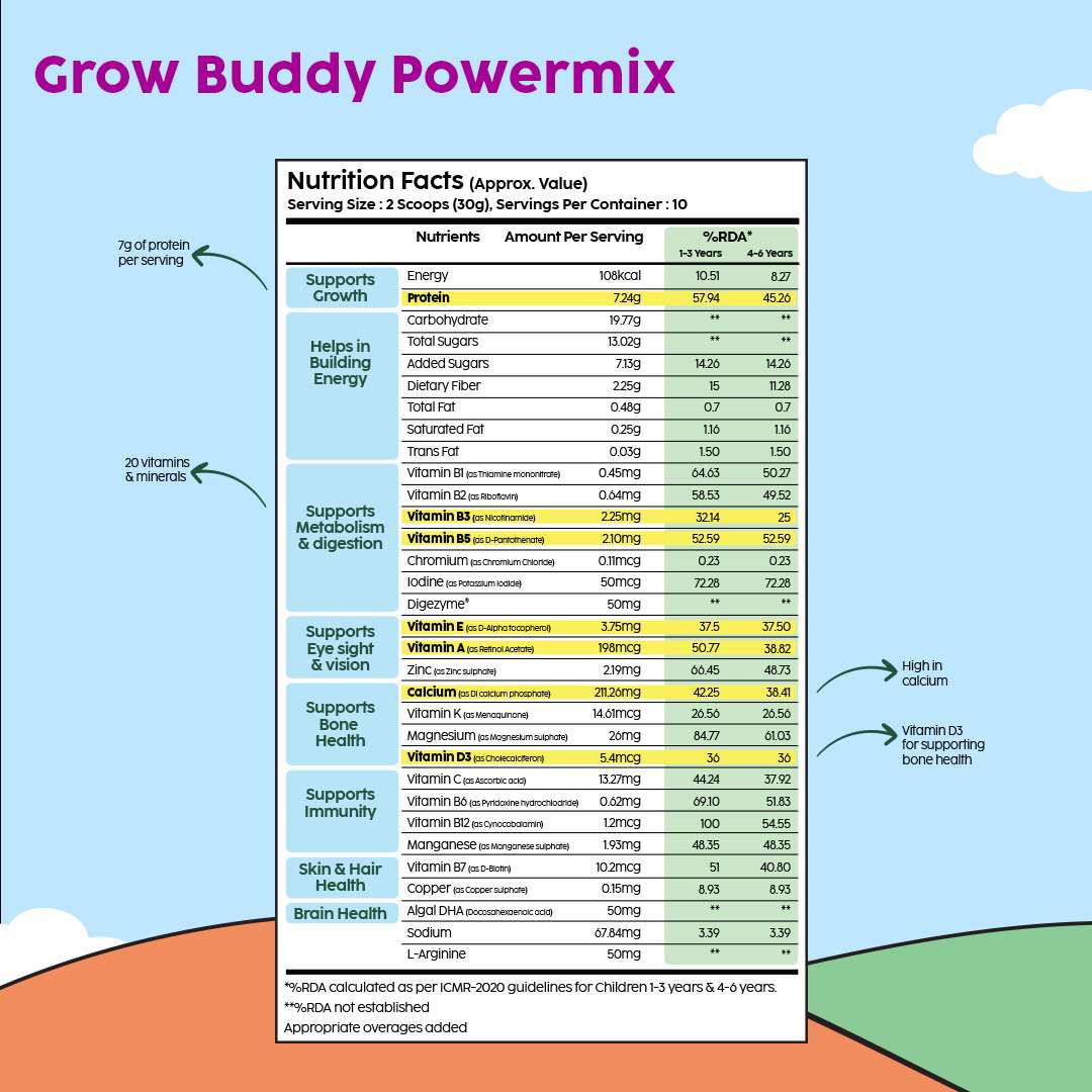 Grow Buddy Powermix is a plant-based protein blend with essential vitamins & minerals that support overall development.