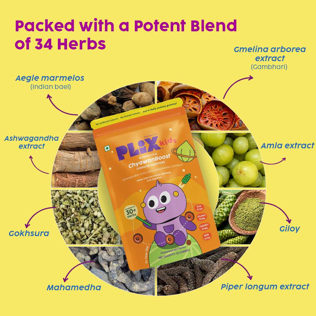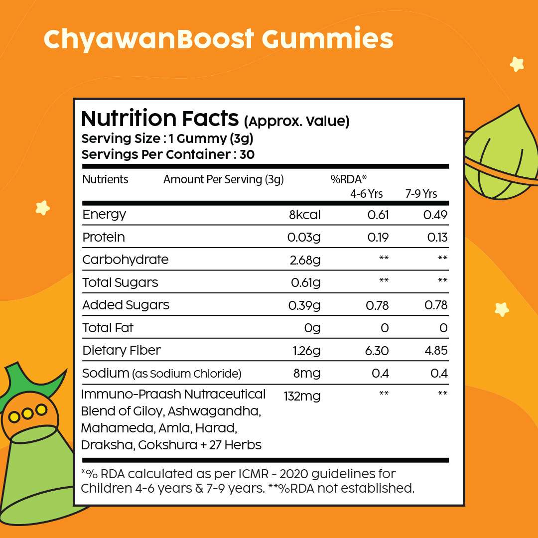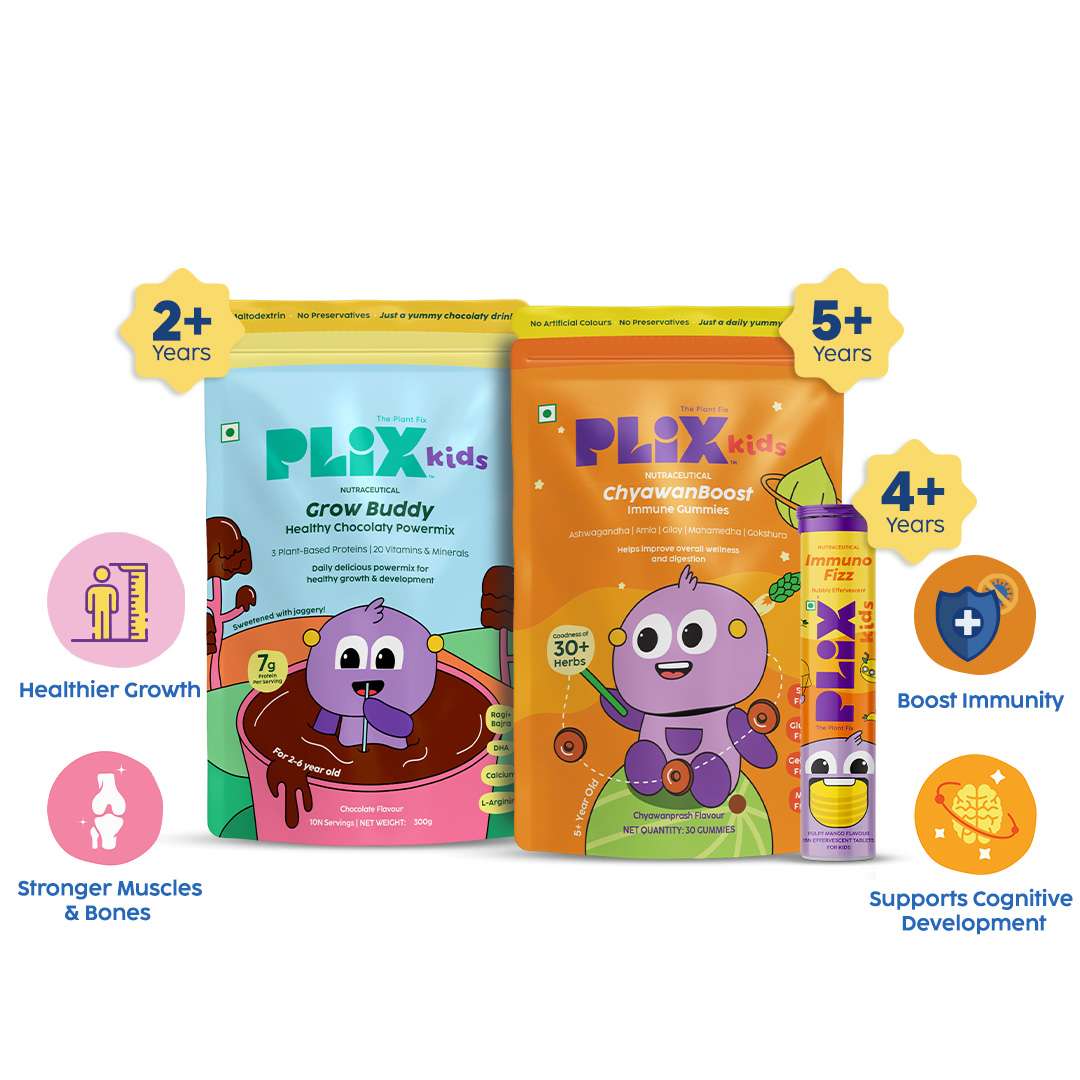 | Ingredients | GrowBuddy: 3 Plant Proteins (Peanut, Mung bean & Almond), Millets Blend (Ragi & Bajra), DHA, L- arginine, Vitamins Blend | ChyawanBoost: Aegle marmelos, Gmelina arborea extract, Ashwagandha extract, Amla extract | ImmunoFizz: Wellmune®, Ginger Extract, Tulsi Extract, Vitamin C |