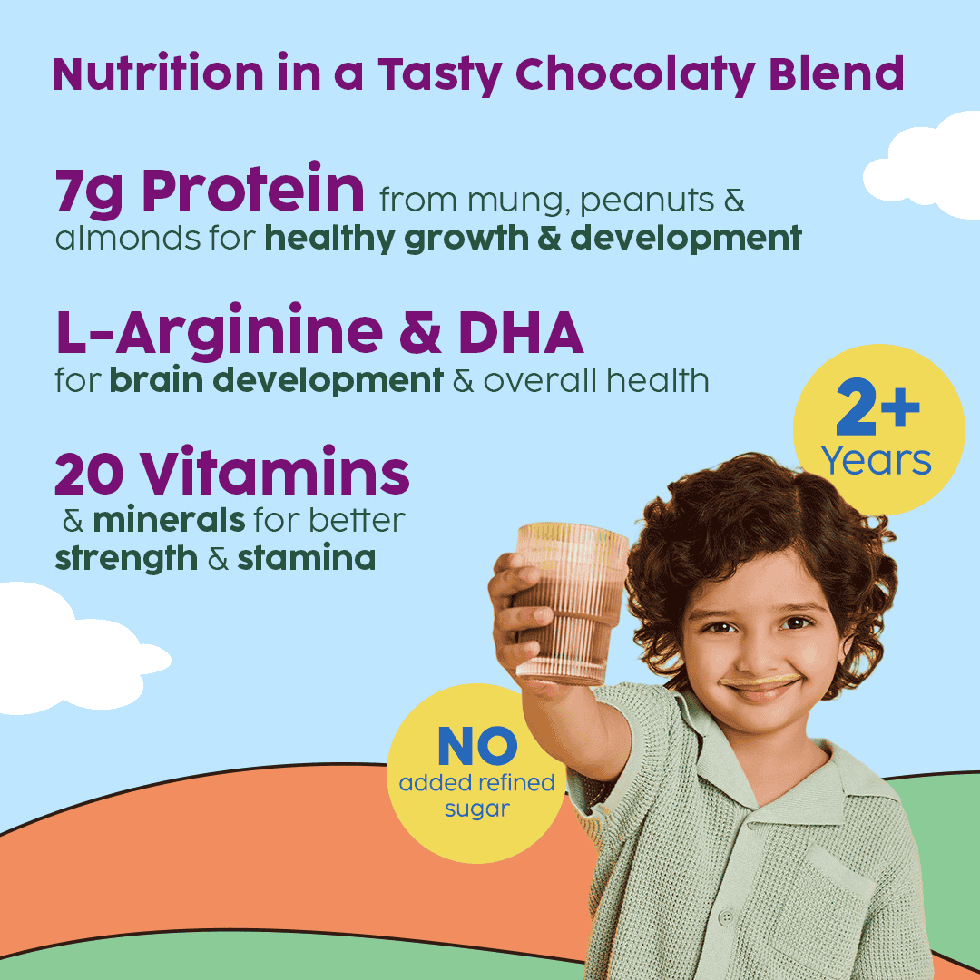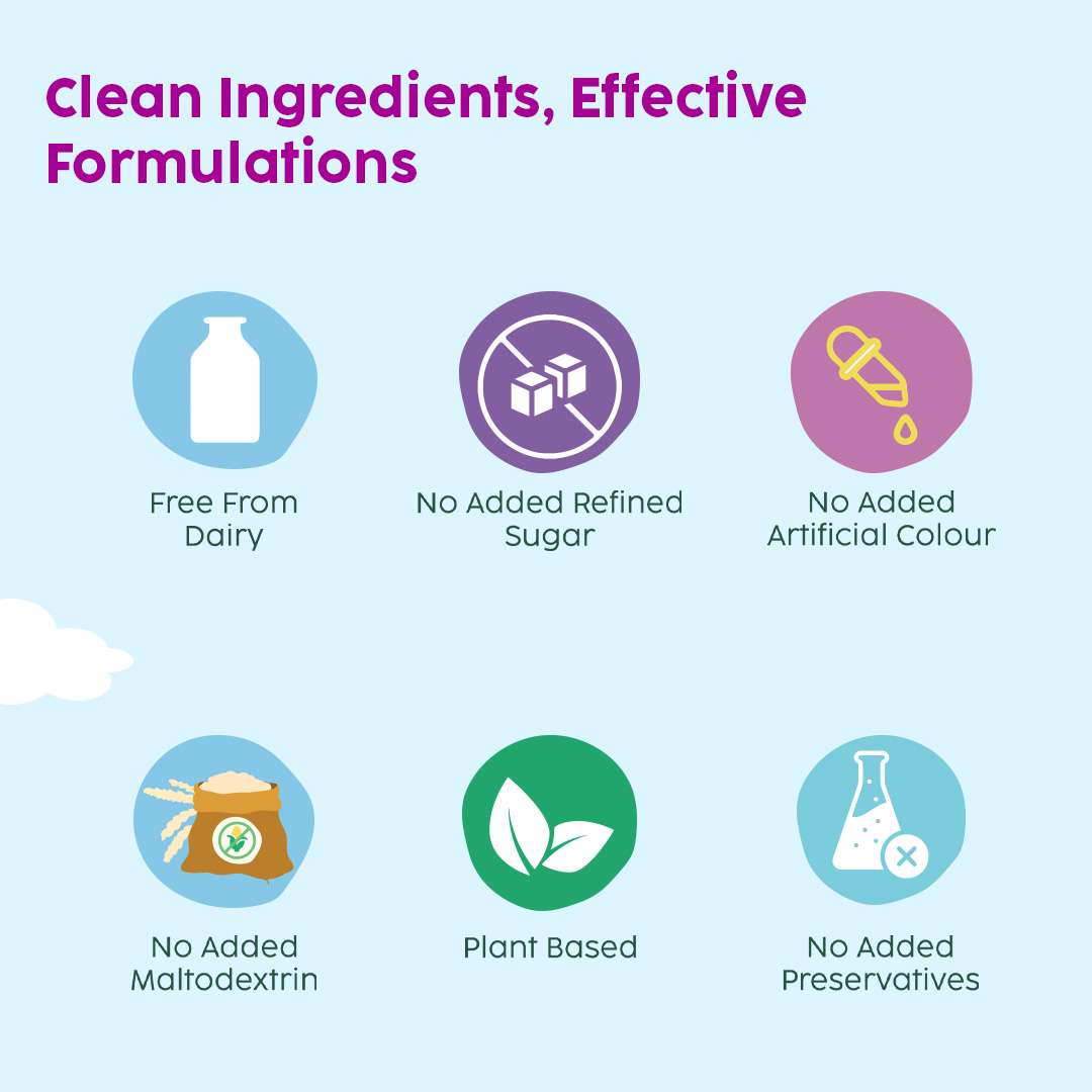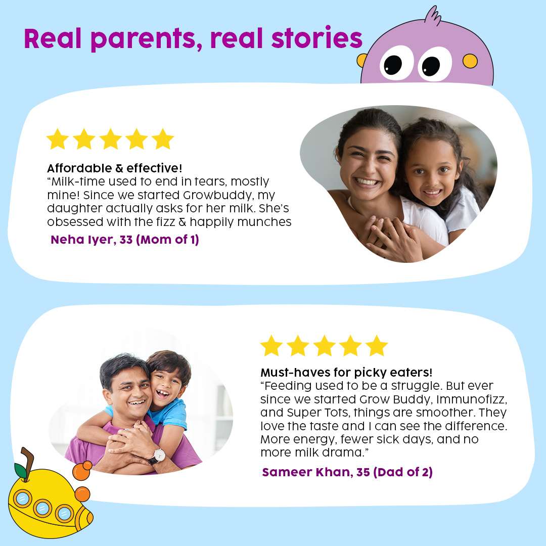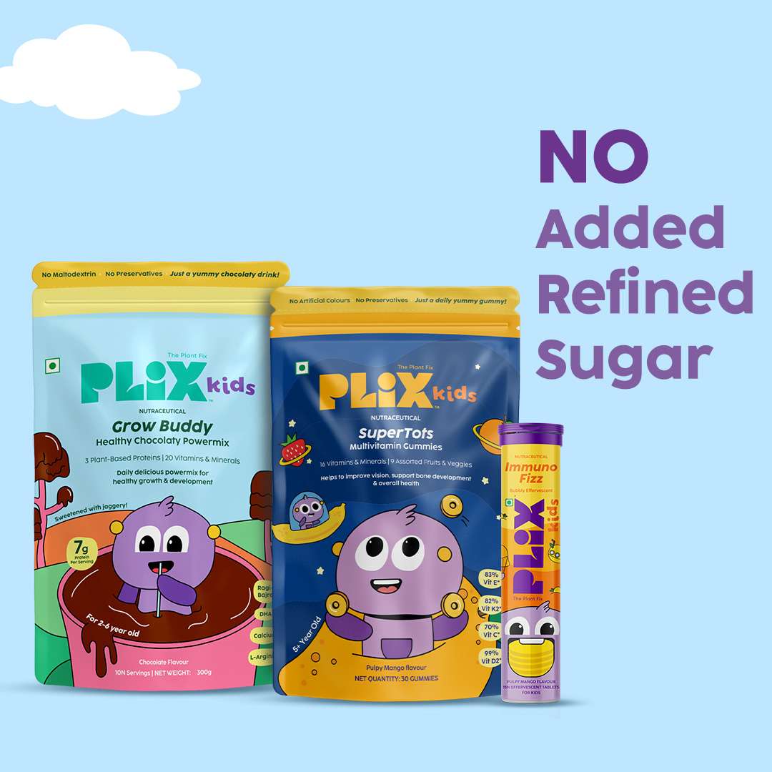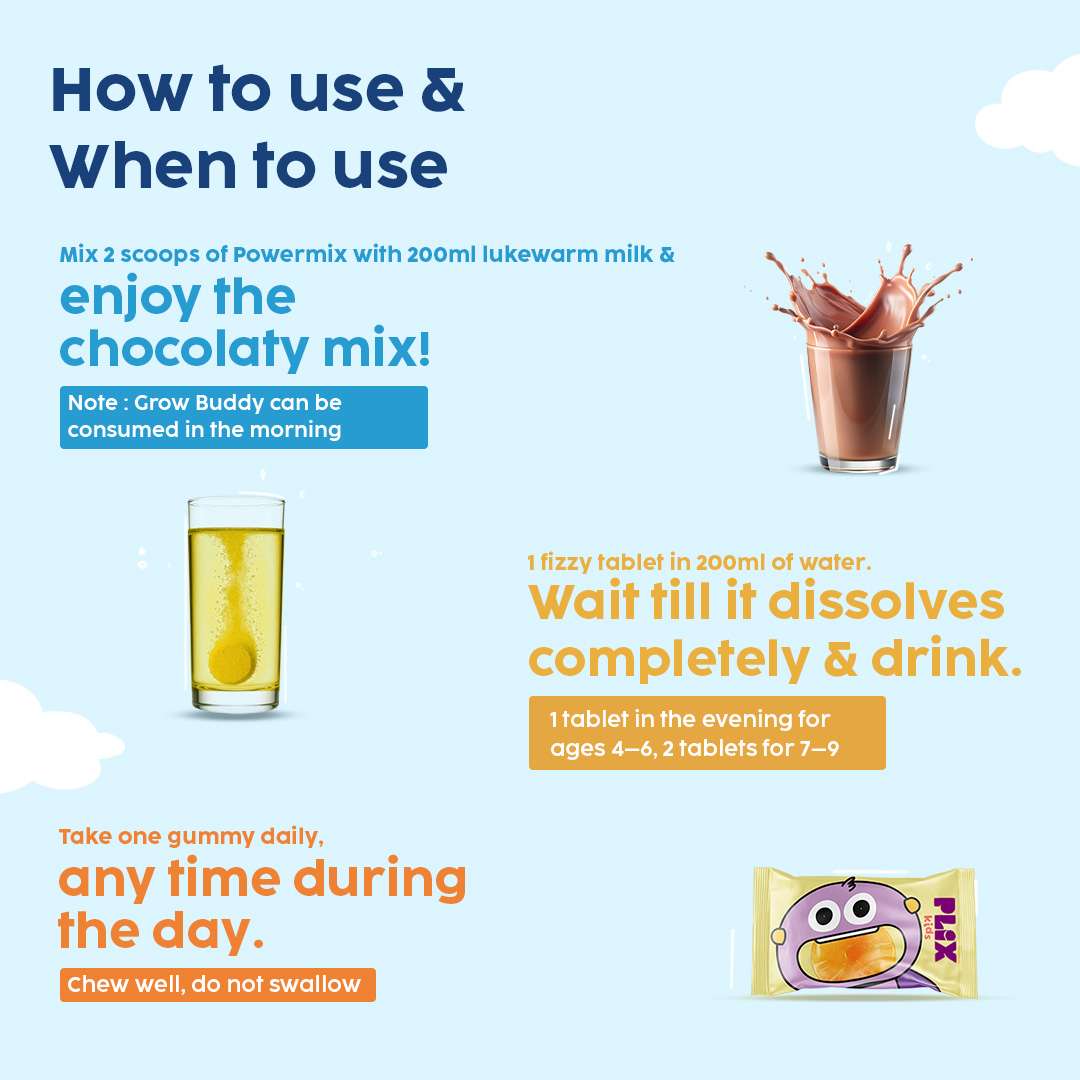 | Ingredients | GrowBuddy: 3 Plant Proteins (Peanut, Mung bean & Almond), Millets Blend (Ragi & Bajra), DHA, L- arginine, Vitamins Blend | SuperTots: Vitamin A, Vitamin B Complex, Vitamin D3, Nutrients packed | ImmunoFizz: Wellmune®, Ginger Extract, Tulsi Extract, Vitamin C |