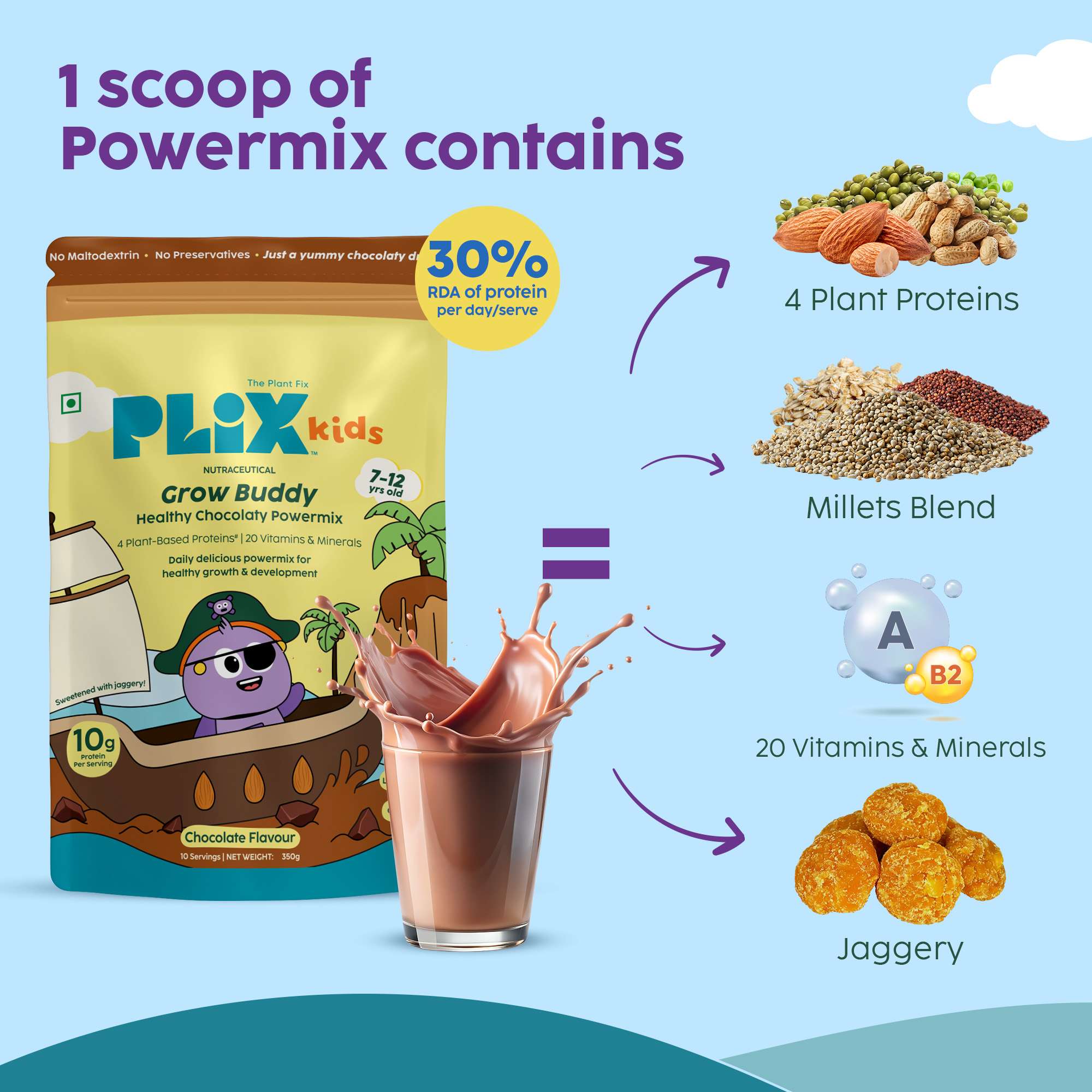Grow Buddy Powermix is a plant-based protein blend with essential vitamins & minerals that support overall development.