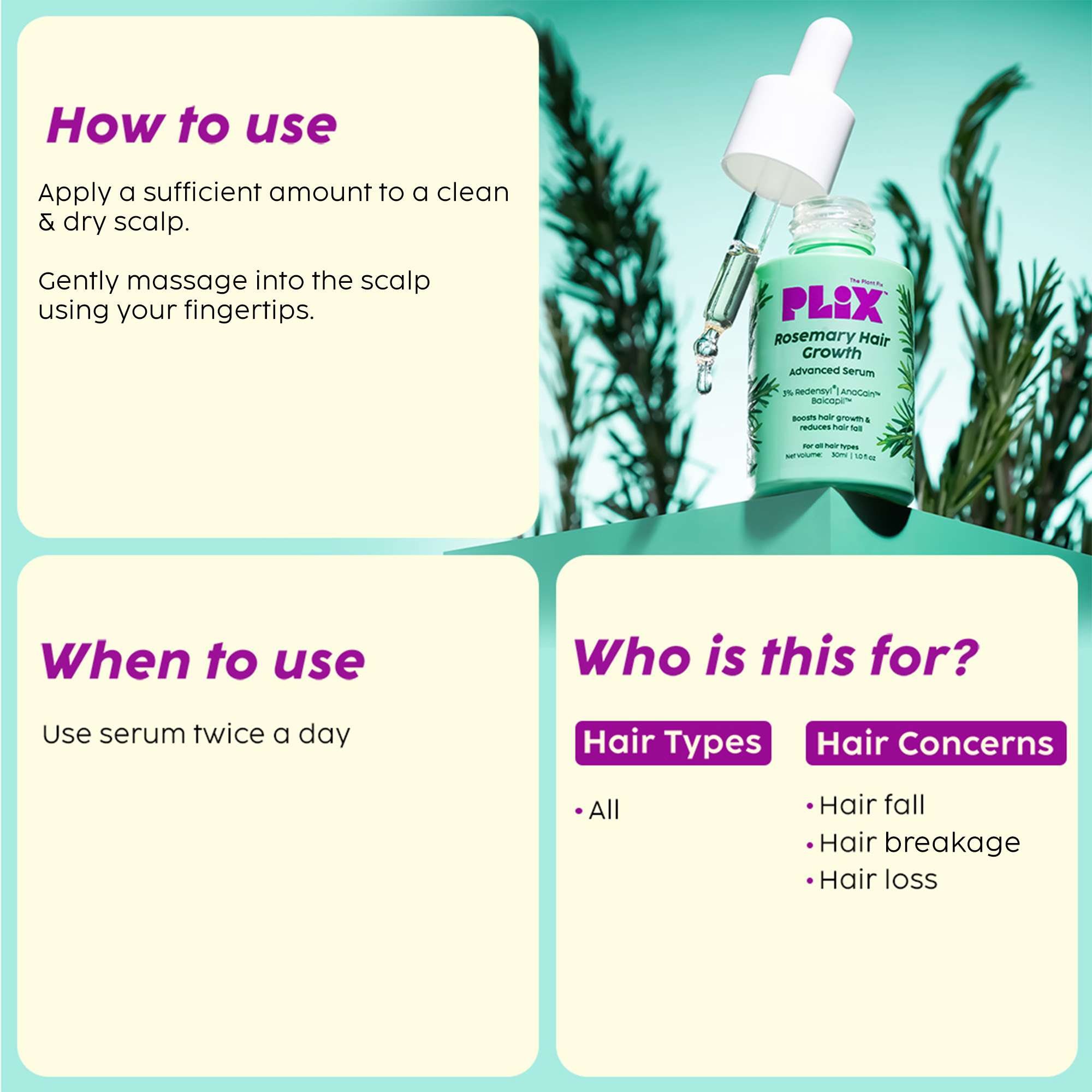 IngredientsSerum - AnaGain TM, Redensyl®, Baicapil TM, Rosemary | Shampoo - 3% Rosemary Extract, Amino Acid Complex, Plant keratin, Rosemary Oil