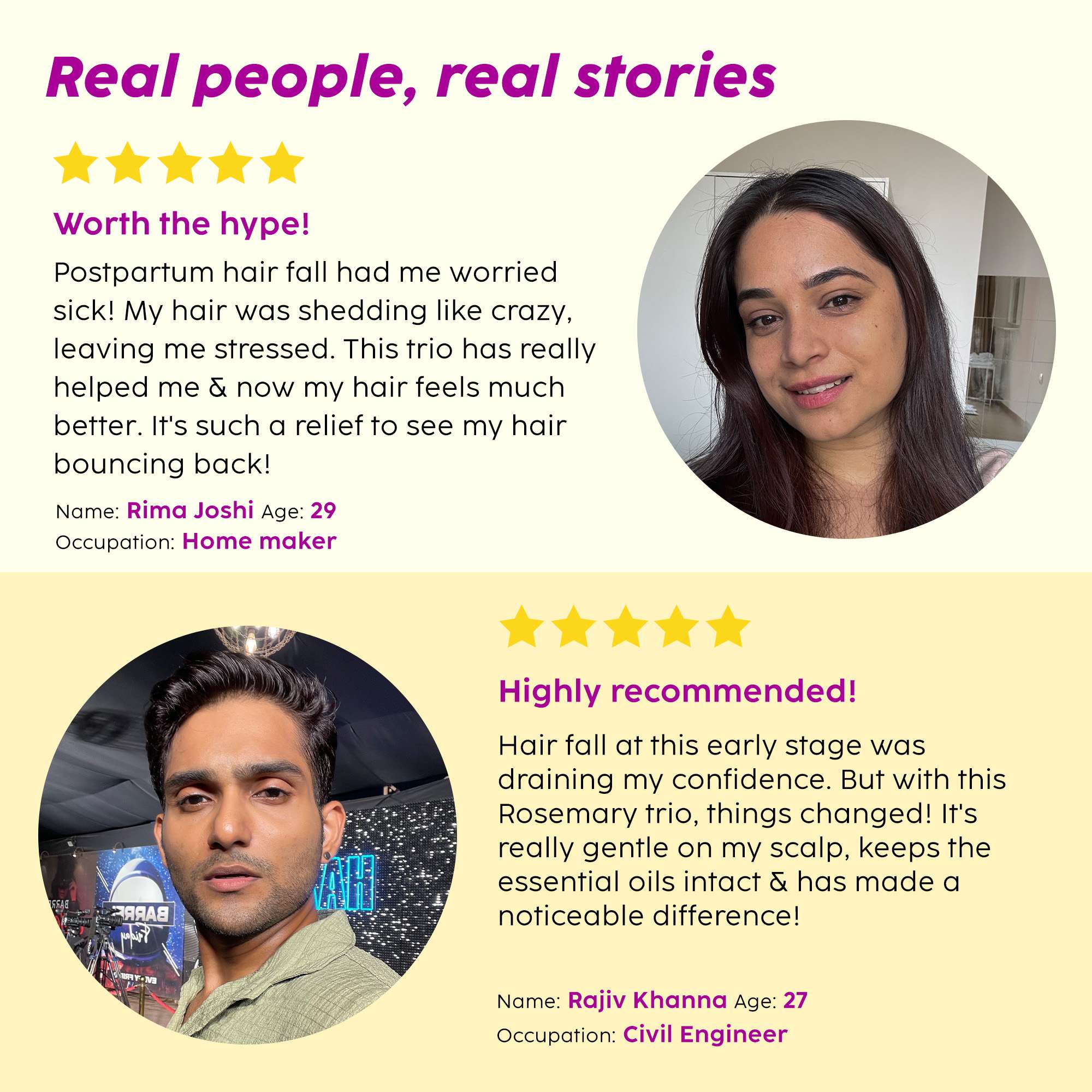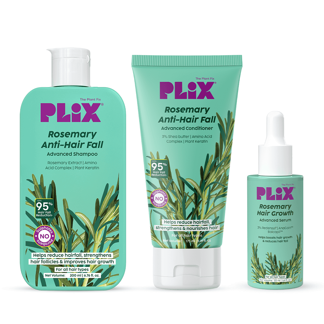 Ingredients | Serum - AnaGain TM, Redensyl®, Baicapil TM, Rosemary | Shampoo - 3% Rosemary Extract, Amino Acid Complex, Plant keratin, Rosemary Oil | Conditioner - 3% Shea butter, Amino Acid Complex, Plant keratin, Rosemary |